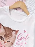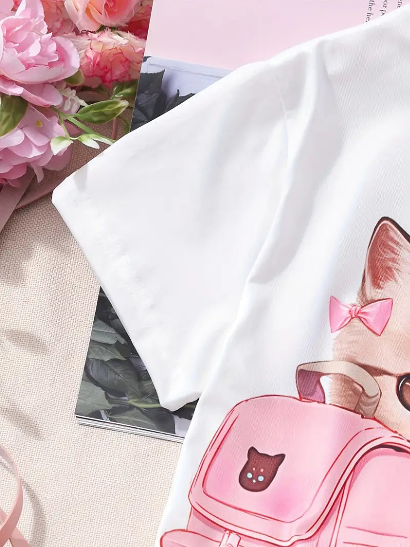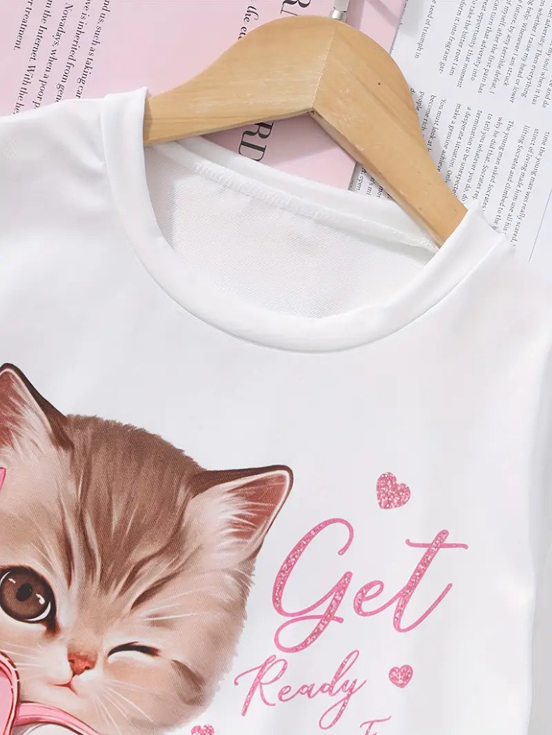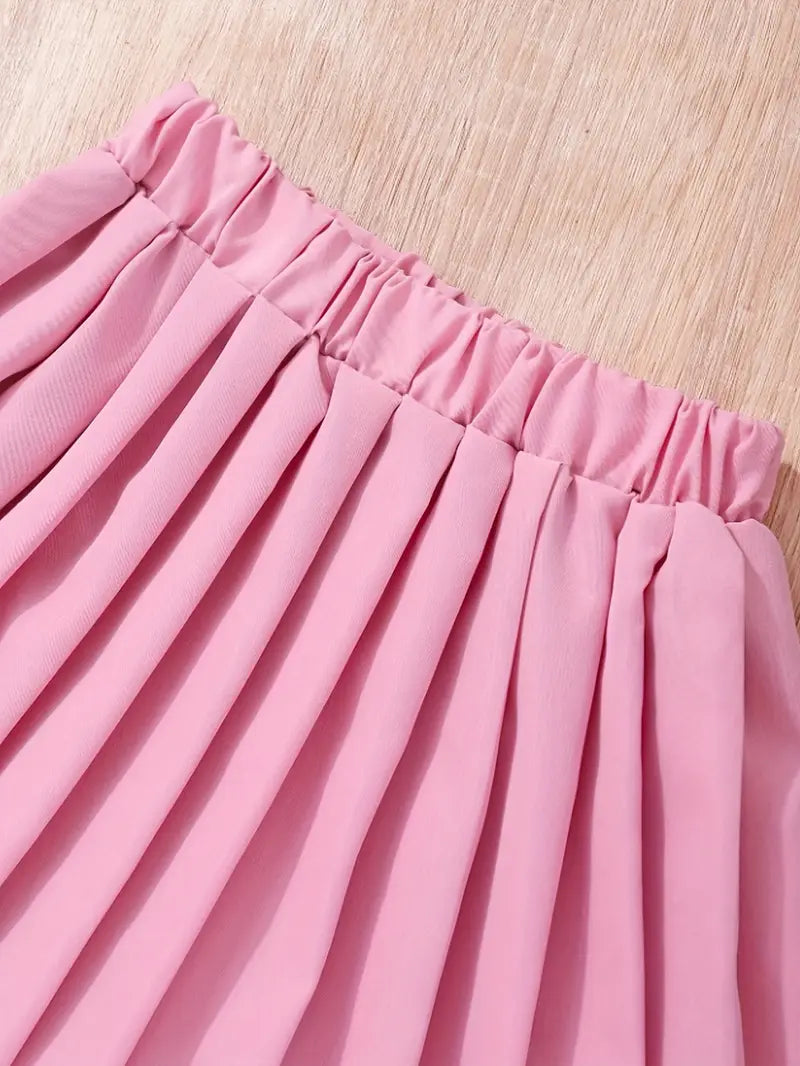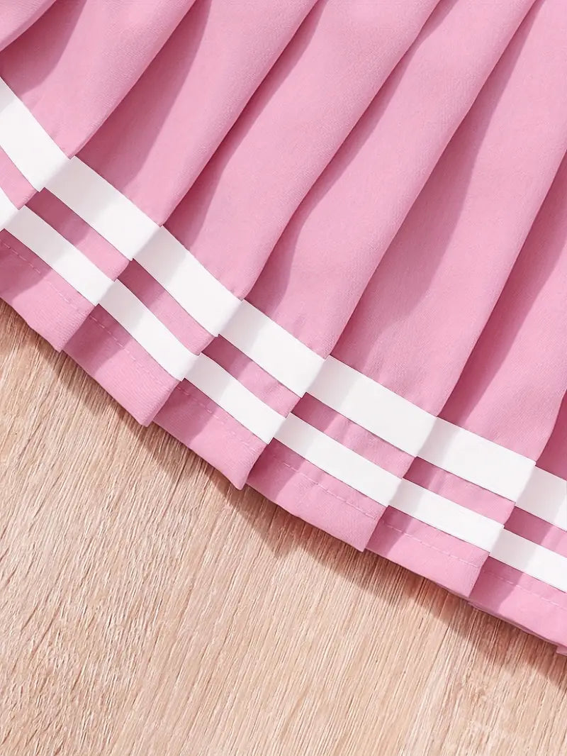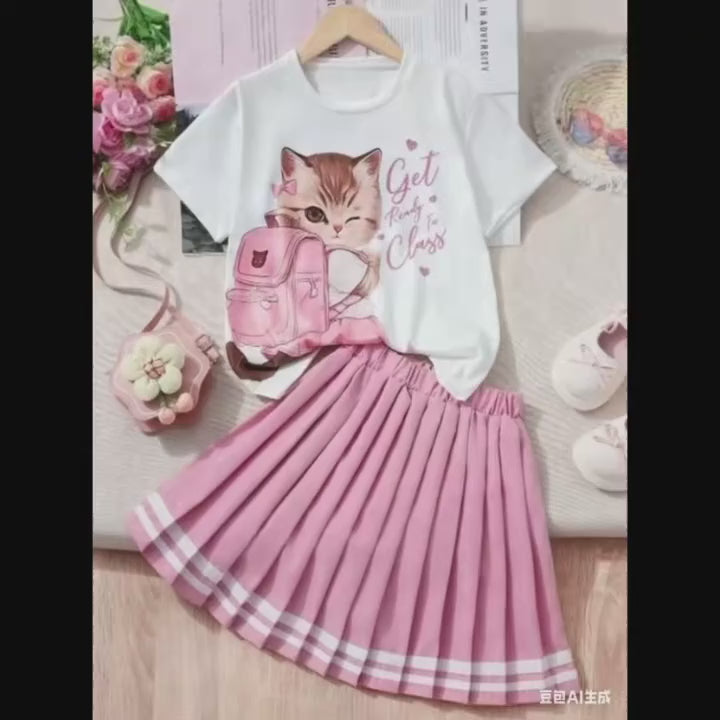 Cute Knitted Summer Girls' Fashion Short Sleeve Round Neck T-Shirt and Elastic Waist Pleated Skirt Set