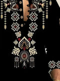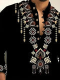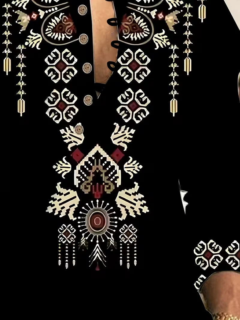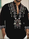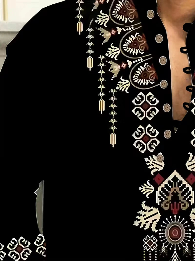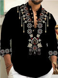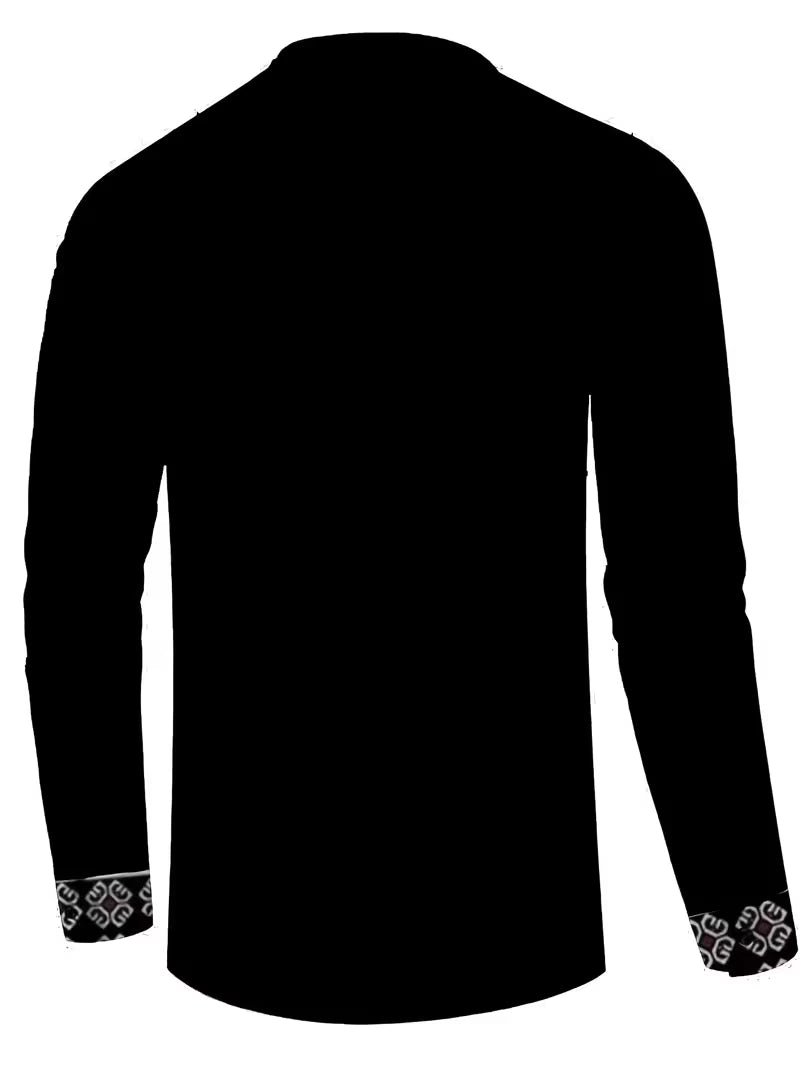 Men's Casual Long Sleeve Button-Up Shirt - Black with Red & Golden Geometric Print, Stand Collar