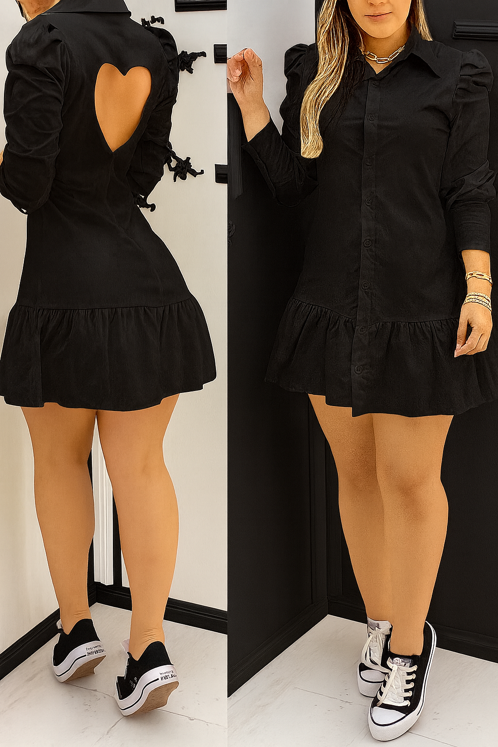 Women's Bright White Heart Cut-Out Back Long Sleeve Shirt Dress with Ruffled Hem & Elastic Waist